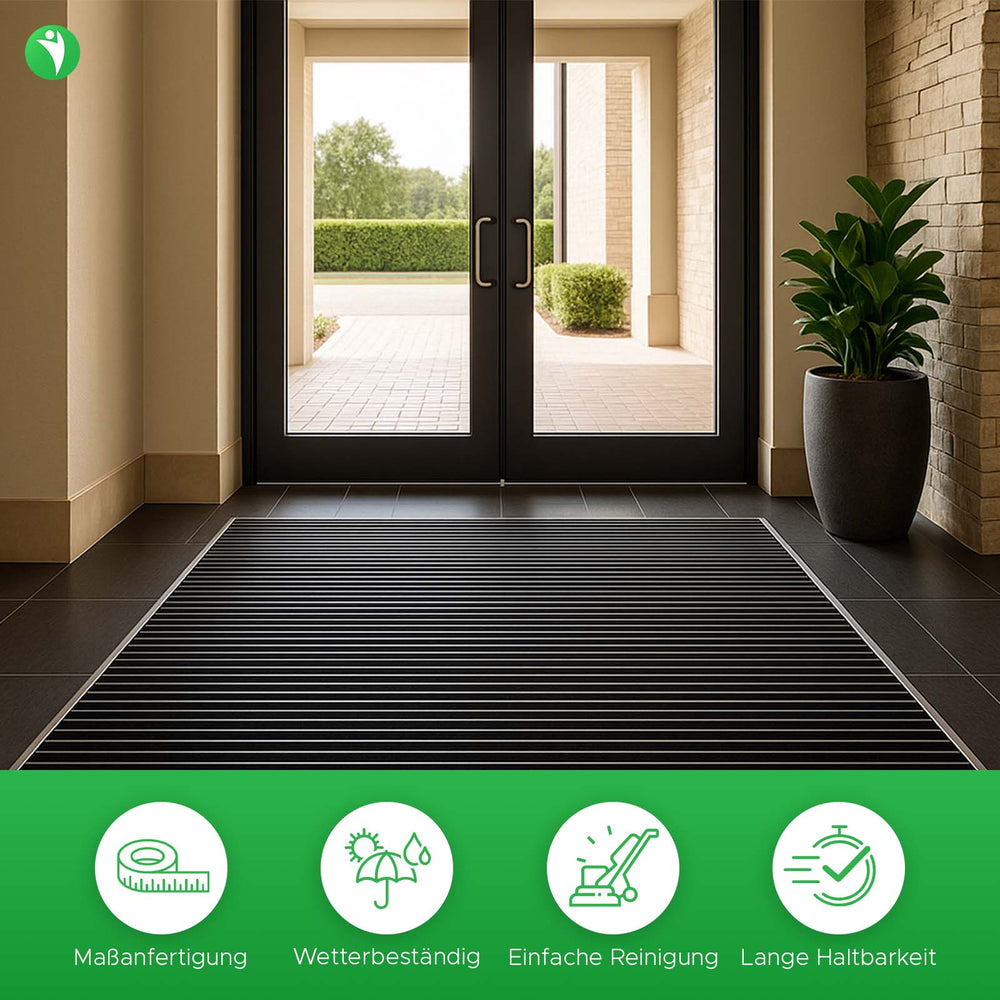 Les systèmes de tapis d'entrée constituent une alternative plus durable aux tapis classiques et se distinguent par leur longévité et leur pouvoir nettoyant élevé. Les entrées des bâtiments commerciaux, intérieures comme extérieures, peuvent être équipées de manière professionnelle grâce aux tapis découpés sur mesure de la gamme ALUPRO.