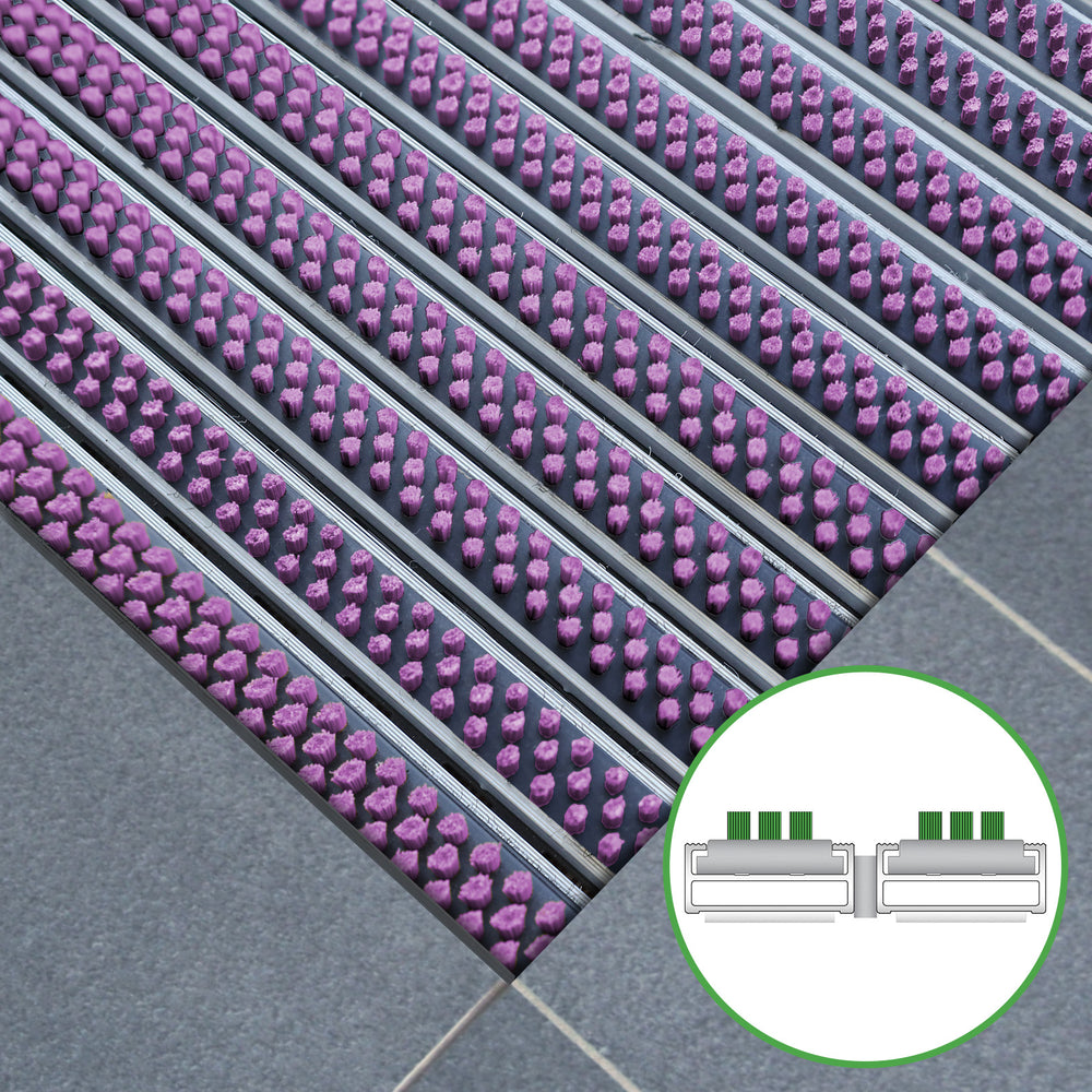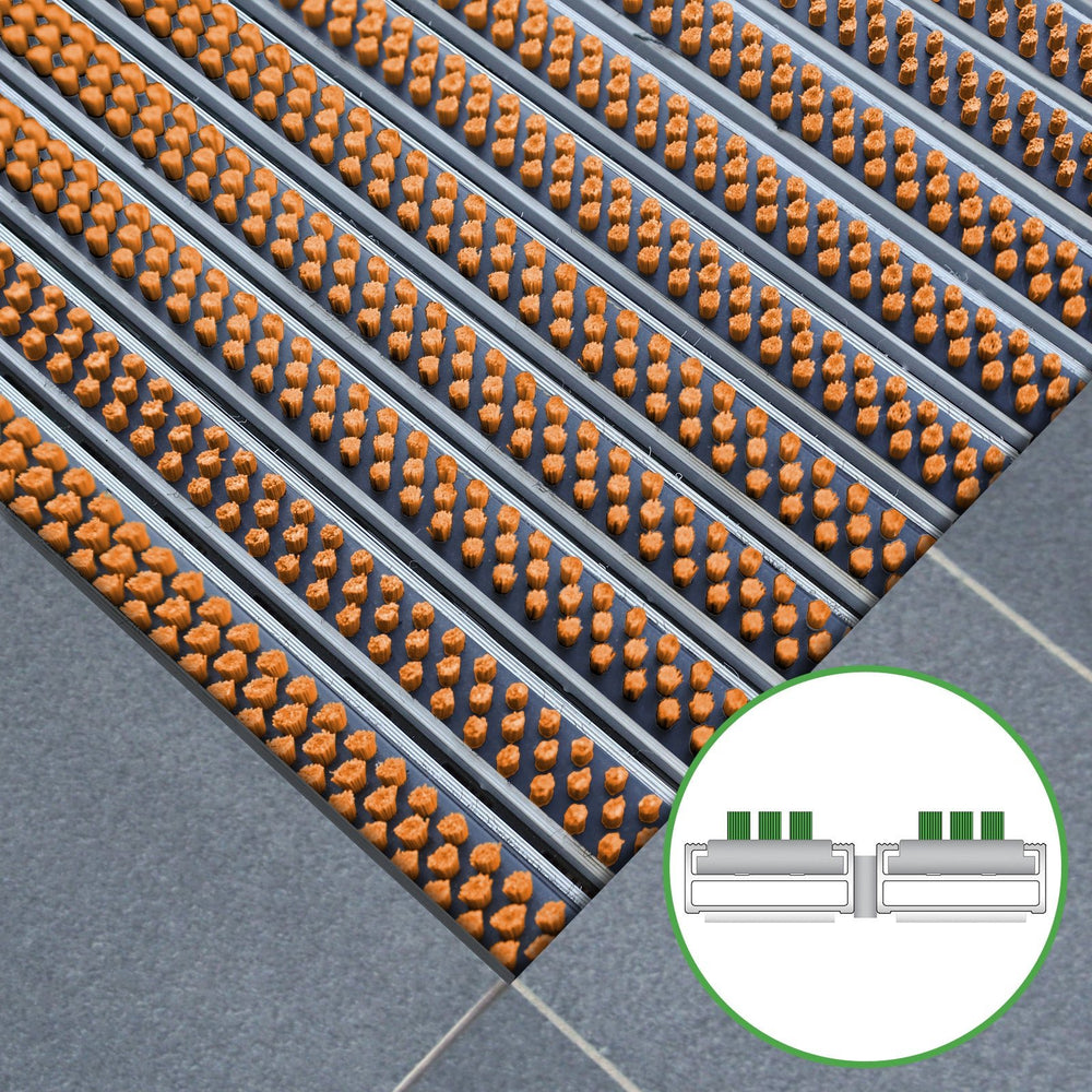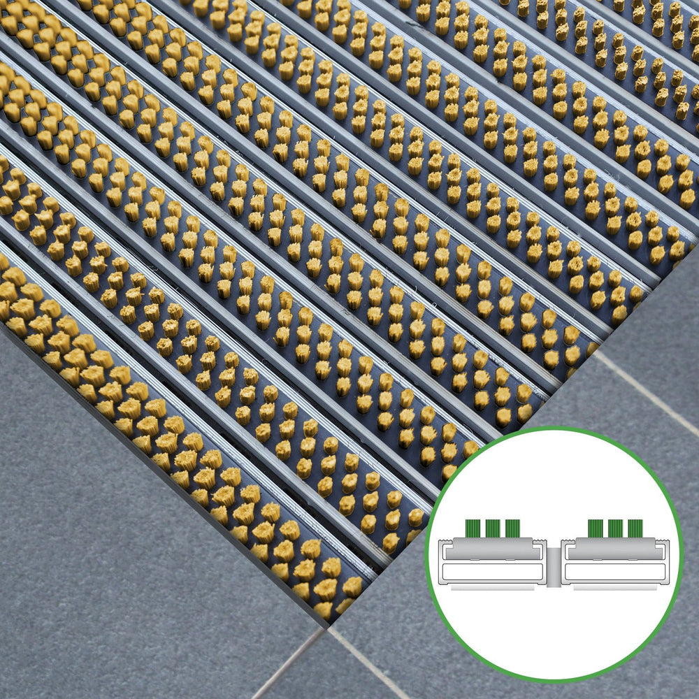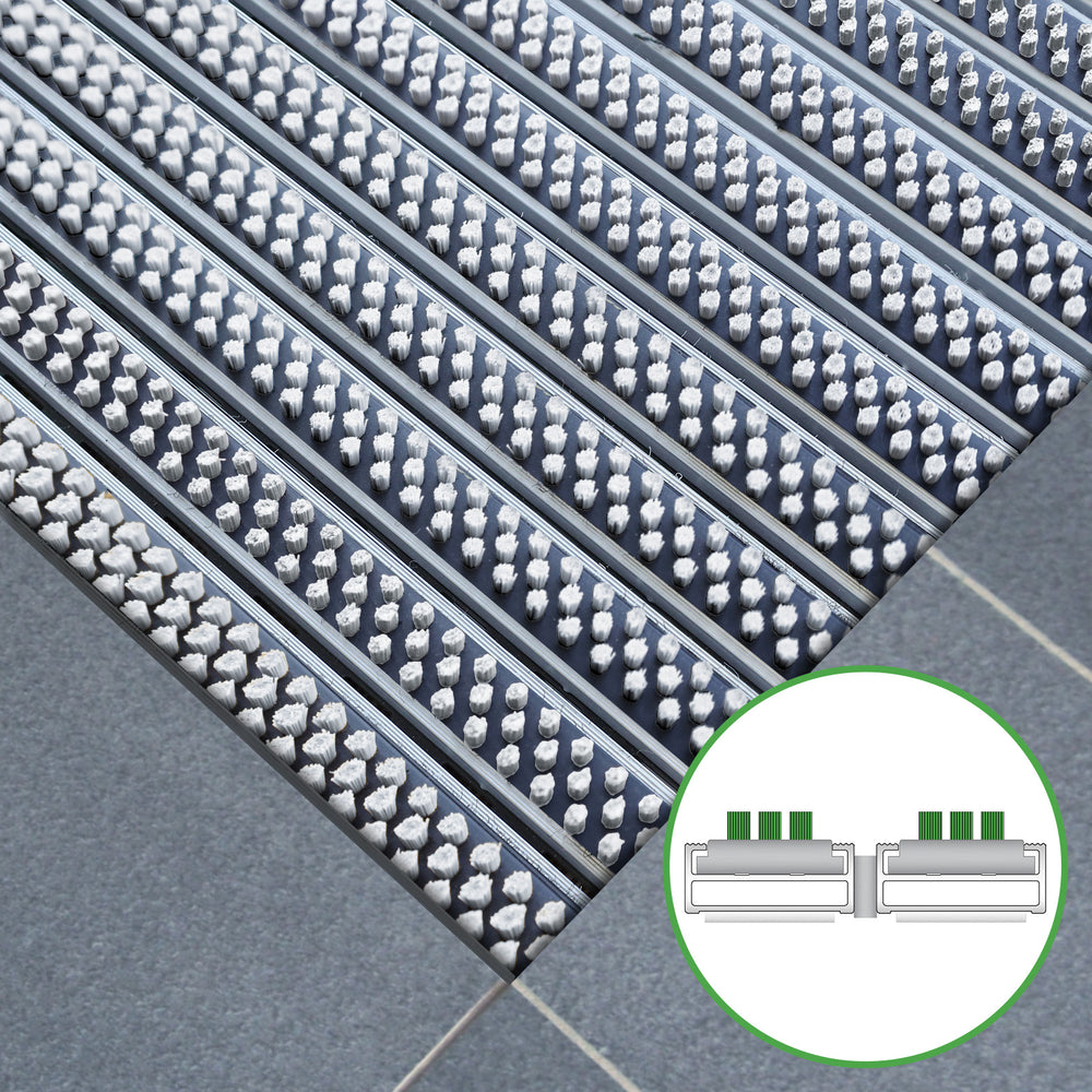 Le tapis brosse est particulièrement adapté à la partie d'un système de tapis d'entrée extérieur destinée à éliminer les saletés grossières des chaussures de vos visiteurs avant même leur entrée dans vos locaux. Cela correspond à la zone 1 d'un système classique de filtration en trois parties. Vous trouverez de plus amples informations et les tapis adaptés à chaque zone sur notre page « Tapis d'entrée pour sols en contrebas ».