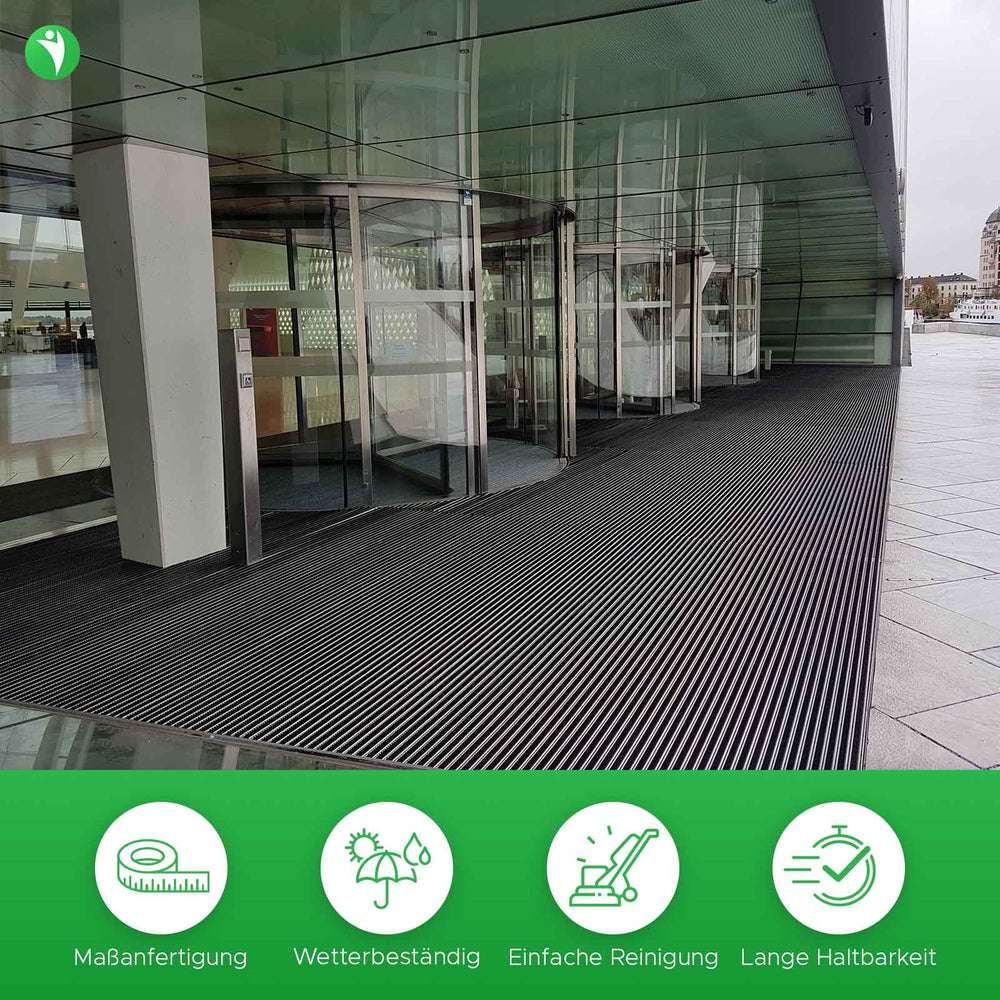 Les tapis profilés en aluminium ALUPRO font partie d'une zone de nettoyage professionnelle, qui vous permet de concevoir des espaces extérieurs et des entrées commerciales dans des immeubles de bureaux, des magasins ou des installations publiques de manière sûre et propre.