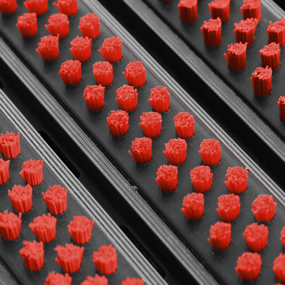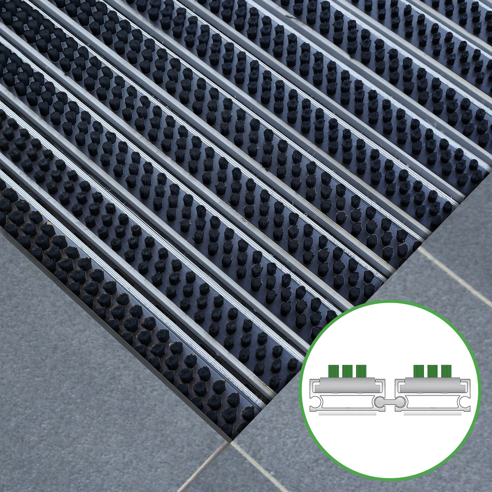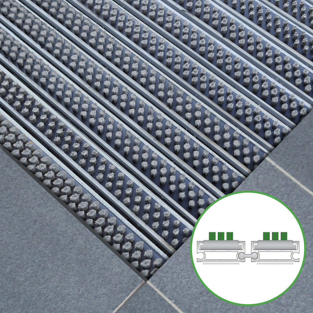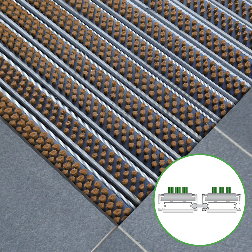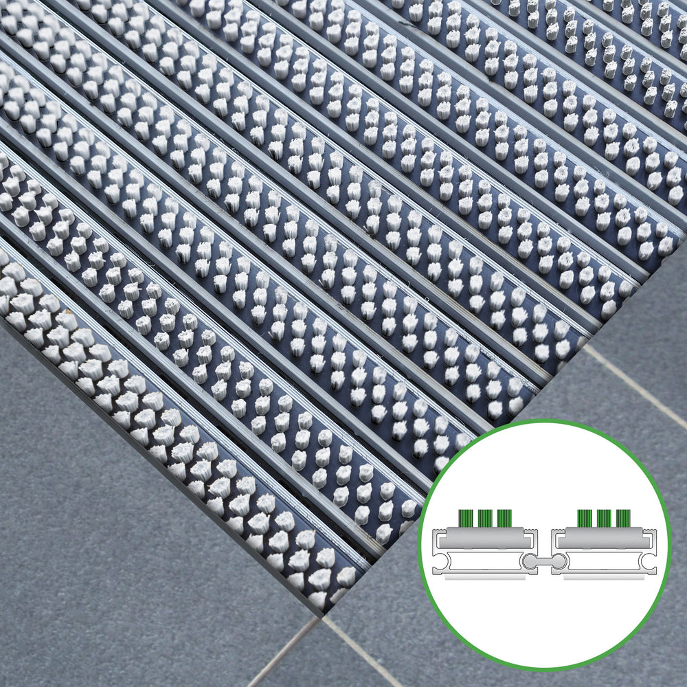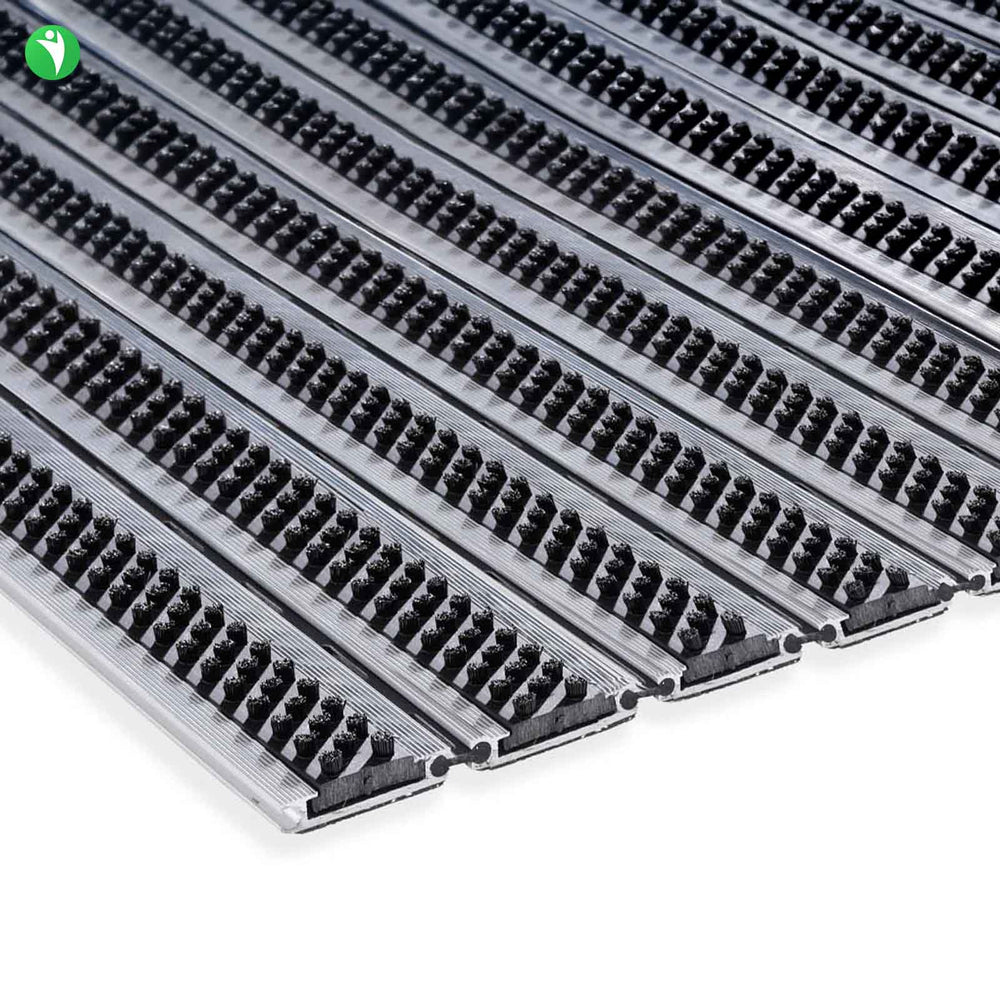 Le tapis ALUFLOW est composé de profilés robustes en aluminium intégrant des brosses en nylon (polyamide 6.6) encastrées dans des lattes en plastique rigide. Conçu pour les charges lourdes et un usage intensif, il résiste aux intempéries et supporte des températures de -50 °C à +90 °C.