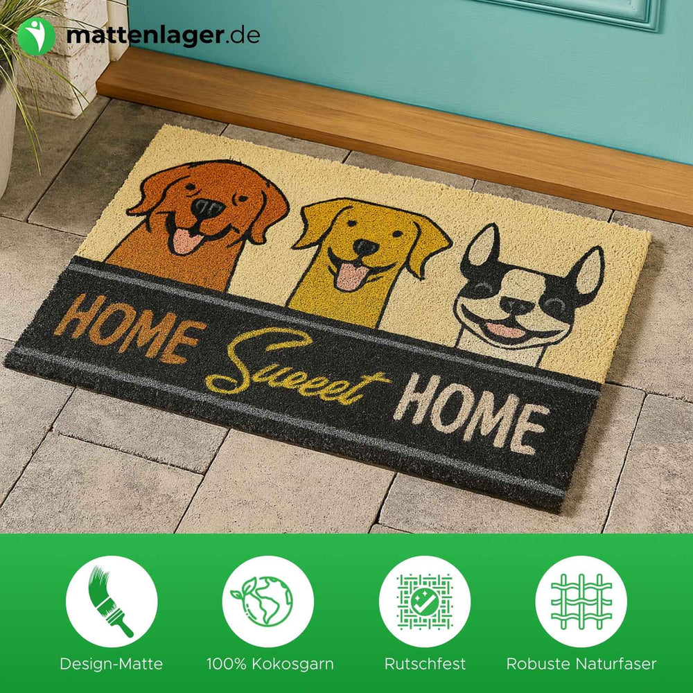 Une maison avec des chiens est une maison chaleureuse. Accueillez vos visiteurs dès l'entrée avec ces adorables compagnons à quatre pattes. Le motif imprimé sur le tapis en noix de coco couleur naturelle est particulièrement éclatant, égayant même les journées pluvieuses les plus maussades. Ceci est dû à la fois à son design attrayant et à ses excellentes propriétés nettoyantes. La saleté et l'humidité sont piégées dans les fibres résistantes du tapis en noix de coco. Ces paillassons sont conçus pour une utilisation extérieure abritée uniquement.